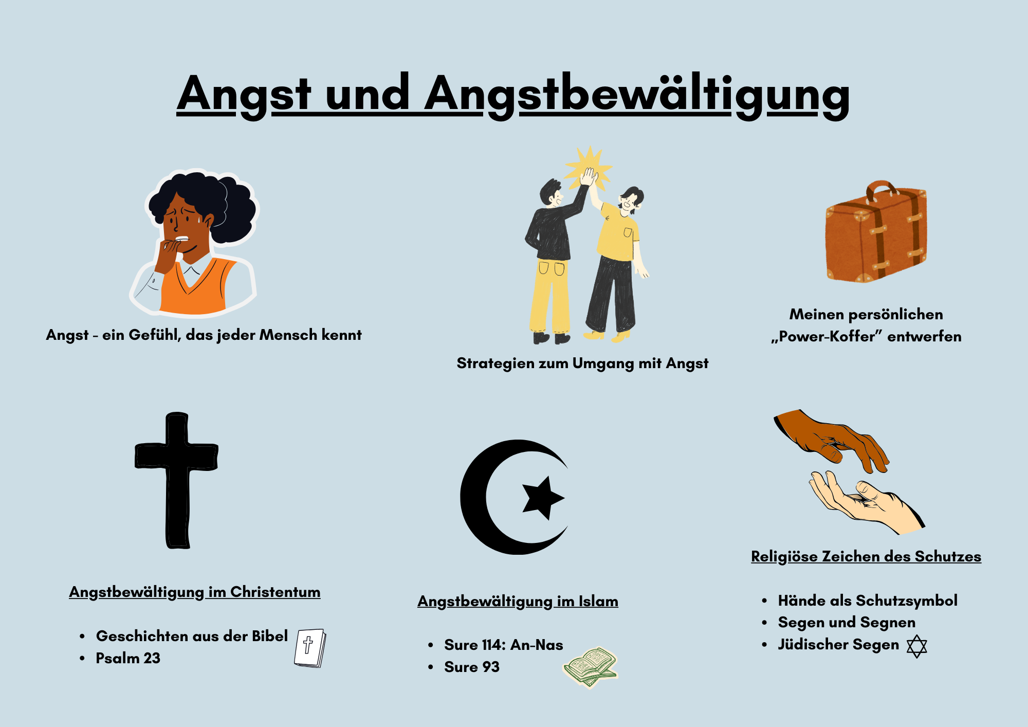 Wir schauen uns Beispiele aus verschiedenen Religionen an, zum Beispiel aus dem Judentum, Christentum und Islam. Dabei überlegen wir, was Menschen Schutz, Halt und Mut geben kann.